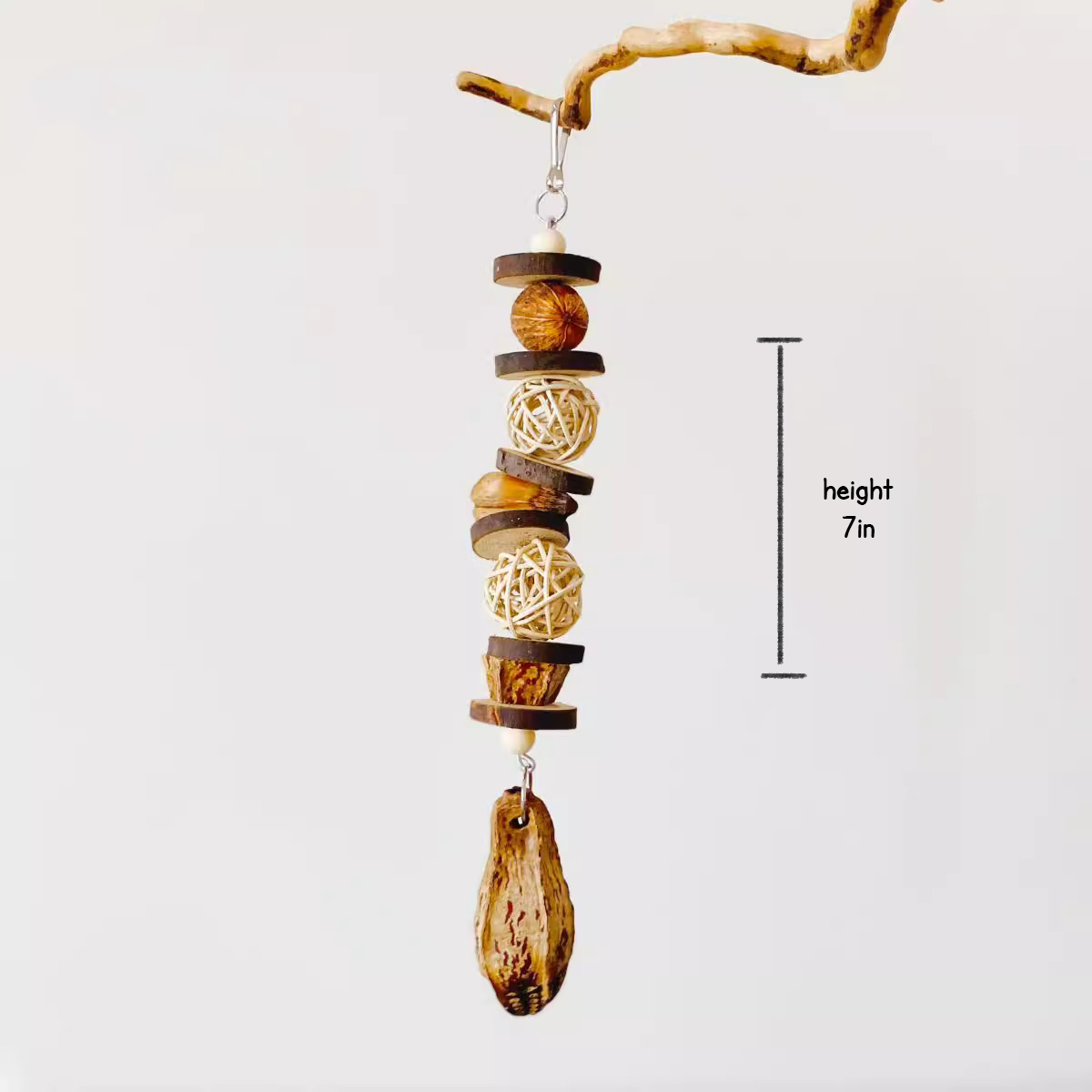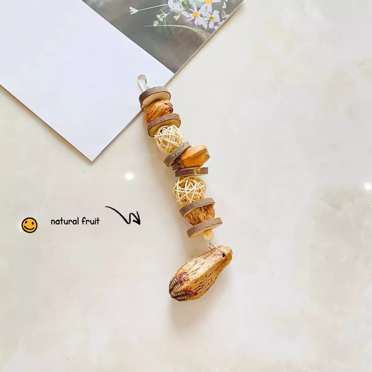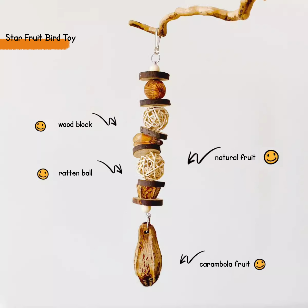 HommiHarvest Carambola Carousel, a splendid representation of nature's gifts tailored for your bird's enjoyment and stimulation. This creation from the HommiHarvest series presents a delightful vertical array of avian entertainment, beginning with durable wood blocks that invite curious beaks for pecking and exploring.